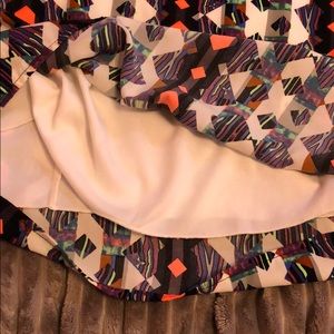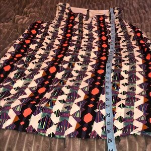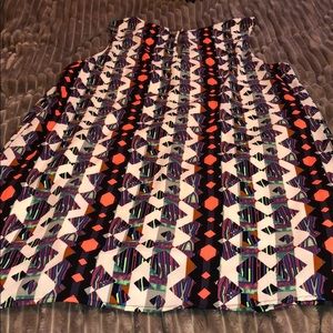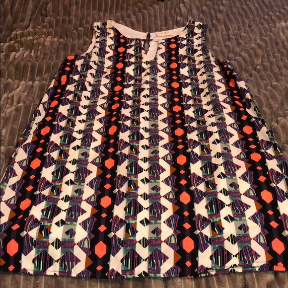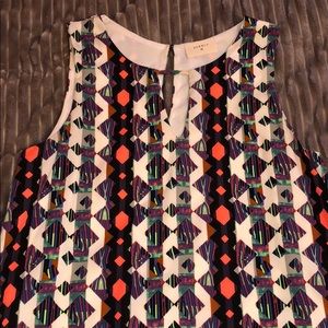 super fun sundress with colorful pattern. keyhole opening in the front and back. back keyhole closes with a button. tank top type dress. dimensions are shown in photos. white lining underneath. great used condition.