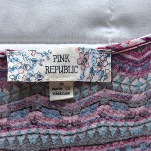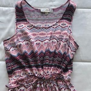 Pink and purple patterned sundress. Very light and breathable material! Drawstring at waist. Small pocket front left. Fits Small but a little short (at least for me, i shrunk it in the dryer 😬)