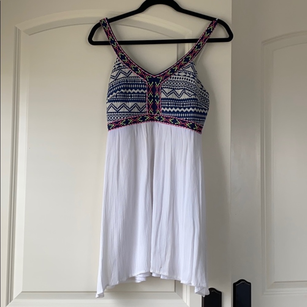 Beautiful white, flowy sundress with patterned detailed top. Great sundress and pairs well with jean jacket.