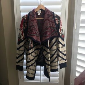 Comfy sweater, navy blue, red, tan patterned, long sleeve