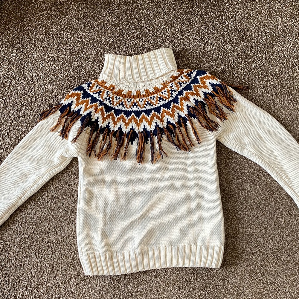 Forever 21 patterned turtle neck sweater, featuring tassels. There is a small non-noticeable hole at the neck line that was there when I bought it. I’ve only worn it a couple times.