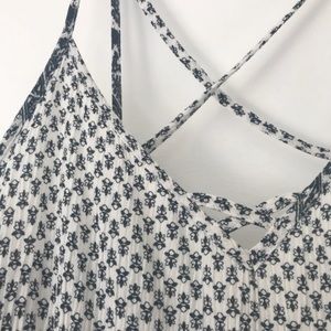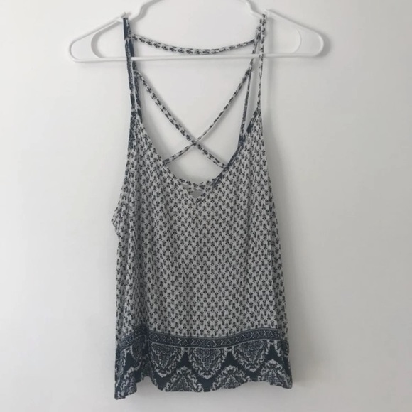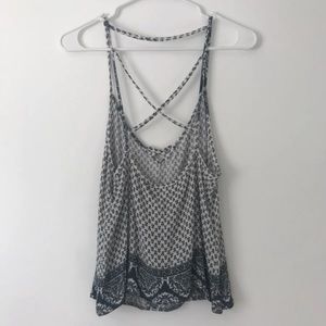 Patterned tank top from Tillys. Straps cross in the back. Tag says XL but fits more like a size S because it shrank in the dryer.