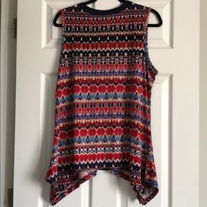 Dressy orange, blue & white tank top. Longer on the sides. Flattering silhouette and pattern. Metal decoration at the neckline. Size Petite XL. 95% polyester