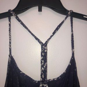 Light-weight top with a fun, summer-y design! This top is navy blue with a white pattern, and has braided straps that collect in the back.