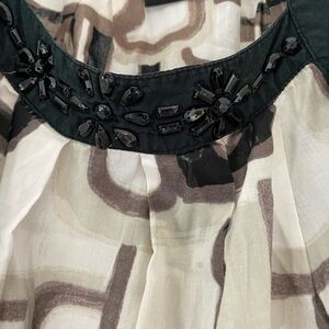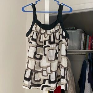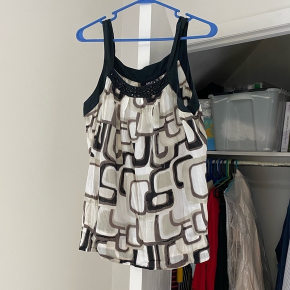 This tank has a relaxed fit, no stretch, and a beaded neckline. Straps are wide enough to wear a bra under! EUC