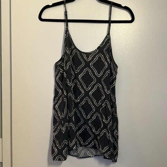Spaghetti strap patterned tank. Color is a dusty greyish blue. Loose fit.