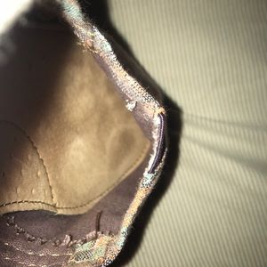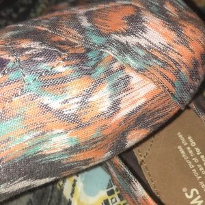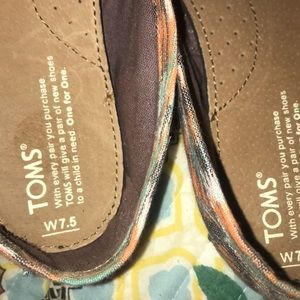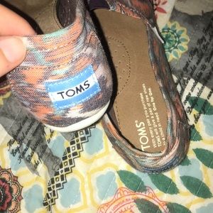 Cute Toms size 7.5. Taupe colored with orange, blush, and teal pattern. Just like new, I only wore them once or twice.