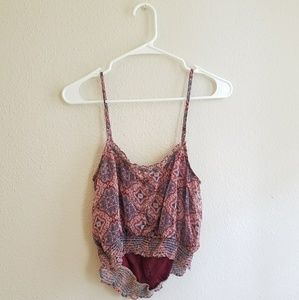 This top has a pretty pattern with muted red, blues and neutrals. The straps are adjustable. This is a shorter top, almost at a longer crop top length. The material is lightweight.