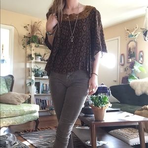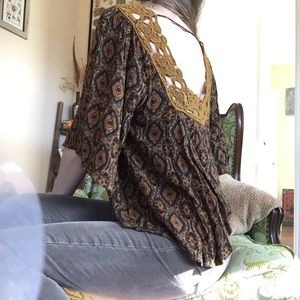 Groovy patterned top with gold detailing around neck and low back. Soft and flowy.