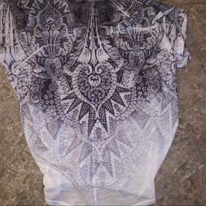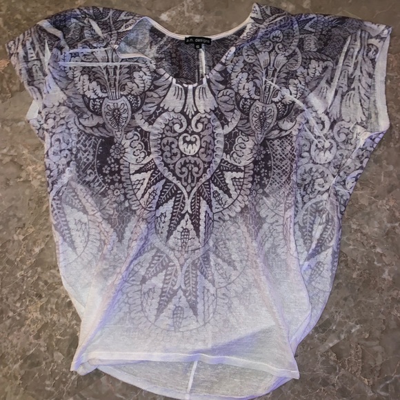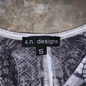 A.n. Designs. Size small. Could probably also fit a medium. Made from polyester and spandex. White and black design. Tighter at the bottom than the top. Gently worn but still in great condition.