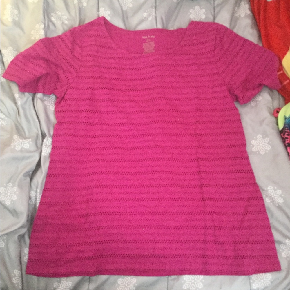 This top has a stylish open weave pattern. The front has an additional layer of fabric under the pattern. The sleeves ave the pattern direct to the skin. The back is a solid fabric.