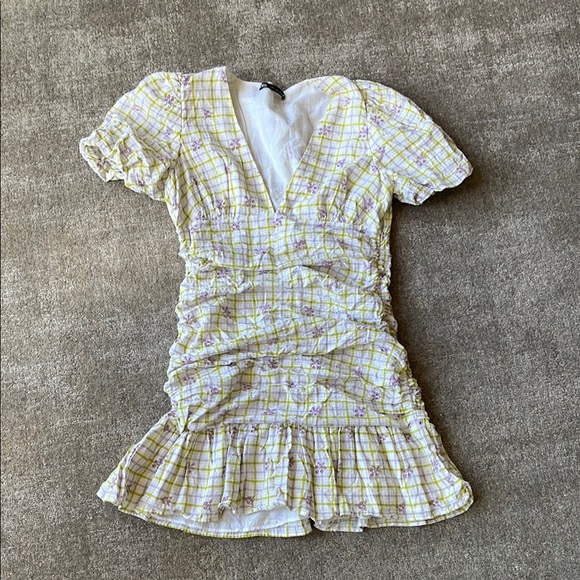 Chic plaid dress with a flattering V-neck and ruffle hem.