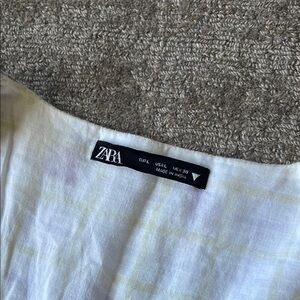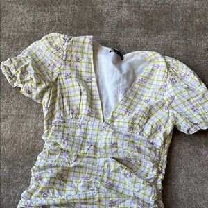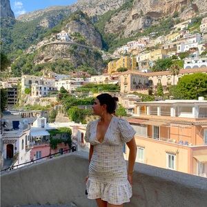 plaid print with little flowers on it. linen. wore this last summer in europe & it was perfect (see last pic)