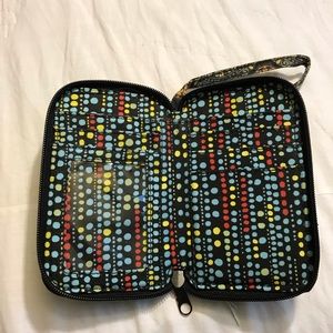 This wallet has space for cards, 2 ID slots with clear protectors, a designate coin pouch, and a phone pocket on the rear. Barely used, comes with a detachable wristlet.
