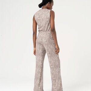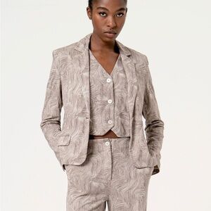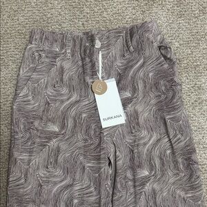 Stylish wide-leg pants with a unique pattern. Features a button closure and side pockets.