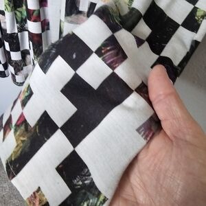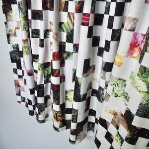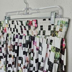 Stylish women's skirt featuring a unique black and white pattern with colorful accents. Perfect for adding a touch of flair to any outfit.