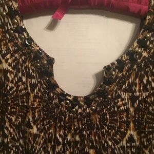 Stylish women's top featuring a unique pattern. Perfect for any occasion. Silky top that is so comfy and can move from work to evening. Black and brass beads along unique neck and 3/4 sleeve