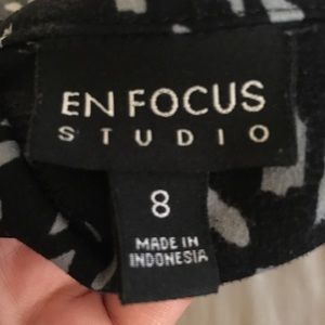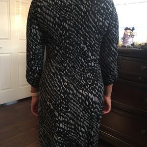 Pastel blue and black patterned dress perfect for work! All buttons and pockets are functional, and the dress is in perfect condition! It ends at the model’s knees who stands 5’2.