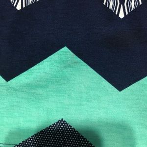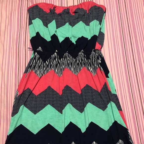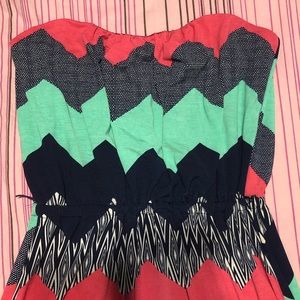 Mini dress with a patterned zig zag, sweetheart neckline, cinched waist with string belt loops. It features zig zag patterns in coral, polka dots, mint, blue, and zebra stripes. Note/there is a pinkish stain on the inside of the skirt, I believe it’s lip gloss, but it doesn’t show through noticeably on the outside.