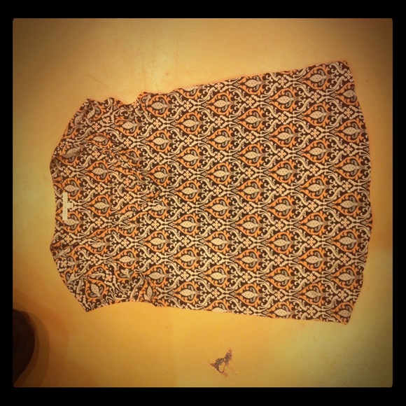 V-neck, patterned blouse. Orange, white, and black. Smaller than it looks.