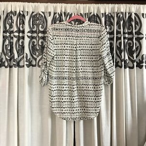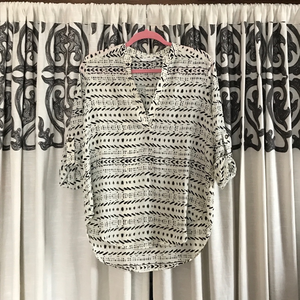 3/4 length button-up sleeves, low cut v-neck. 100% polyester, dry-clean only.