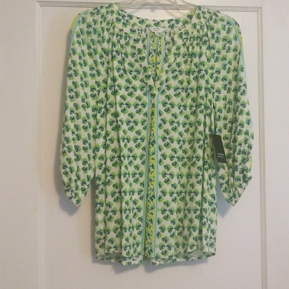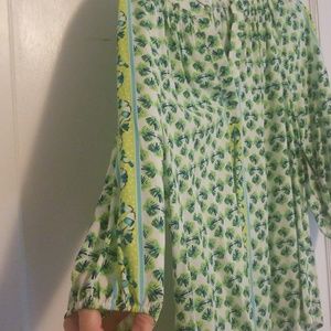 Green patterned Crown & Ivy 1/4 inch sleeves. I normally wear medium and this fits great!