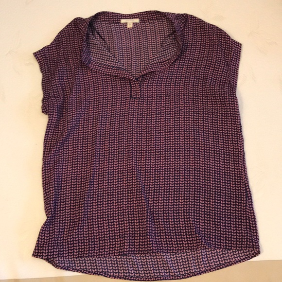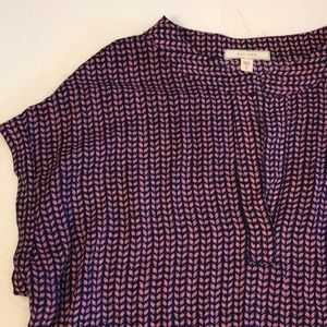 Pink and navy patterned blouse, collarless neckline with v neck slit and cuffed sleeves