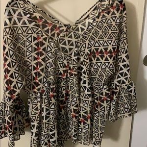 Sheer cross strapped back blouse! Pretty triangle pattern with black red and white on cream base