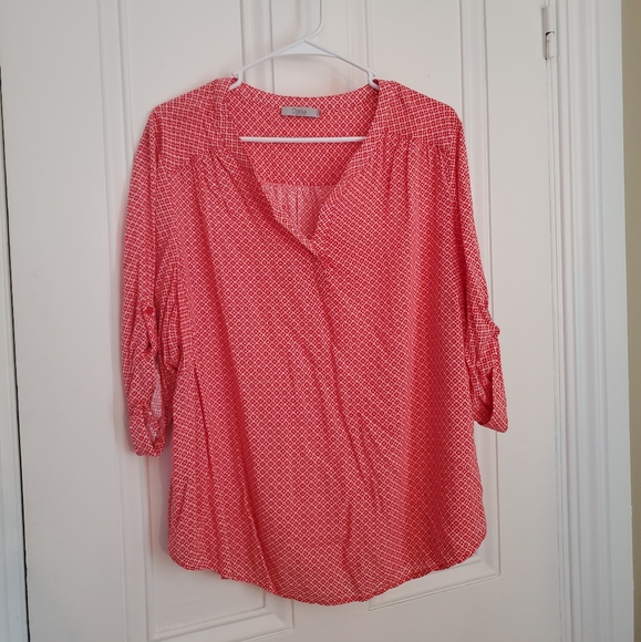 Lightly worn, quarter sleeves and very soft No stains or tears! The circle pattern is cute and shaped to be flattering!