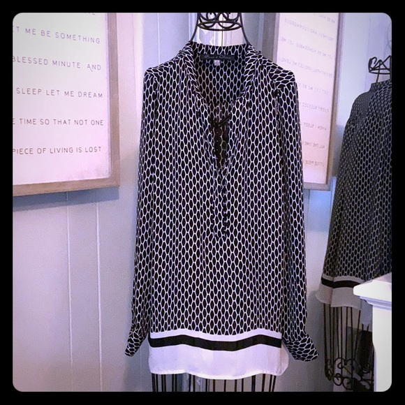 Gently used black and white patterned blouse. ‼️NO STAINS OR BELMISHES 💕 Size Small but fits more like a MEDIUM