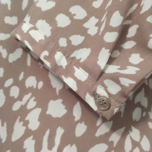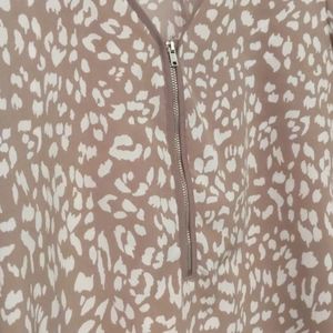 Leopard print pattern blouse with zipper at bust and button on sleeve.