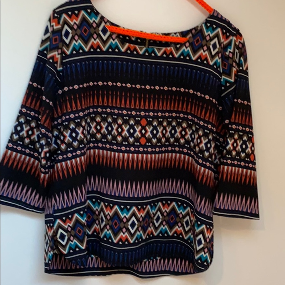 Pullover with upper back zipper closure. Kind of Art Deco, kind of tribal print. Awesome with jeans. Dress up or down. From Stitch Fix. Worn just a few times, great condition.