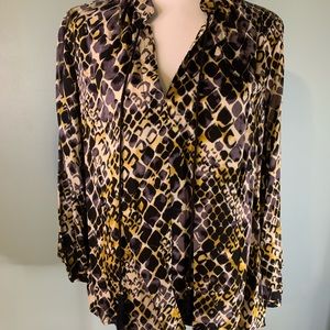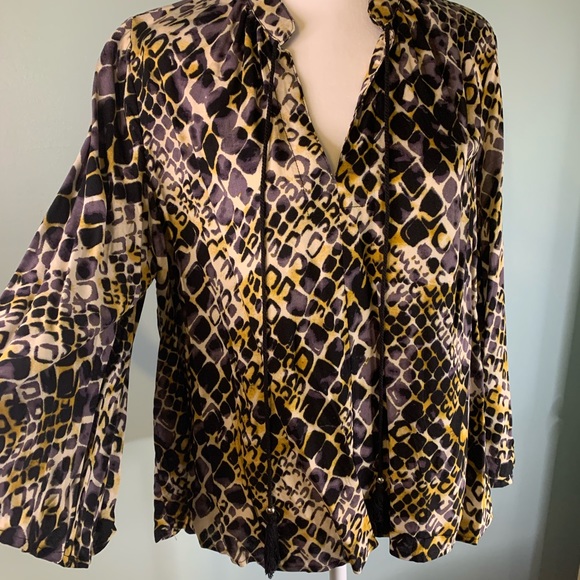 Patterned blouse with tassel strings. Black tan and white. Non smoke environment. Wide sleeves.