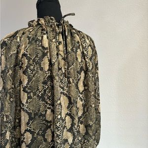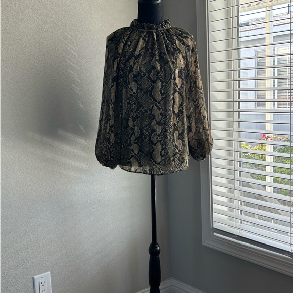 Patterned blouse in sheer, crêped fabric. Low stand-up collar, keyhole opening at back of neck with covered straps, gathers at shoulders, and long sleeves