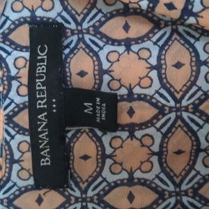 Banana Republic button up blouse with narrow tie attached to collar. Somewhat sheer, you may want to wear a camisole under this. Looks great dressed up with a blazer or dressed down with jeans. Colors are white, tan, and navy blue.