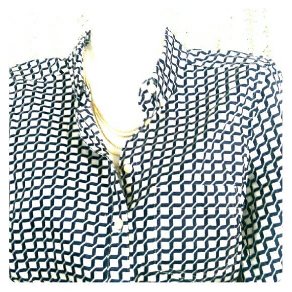 This shirt compliments jeans or professional attire, it looks like a black and white but it also hints at being very dark navy blue also.