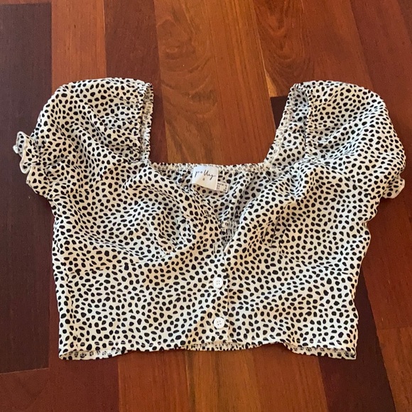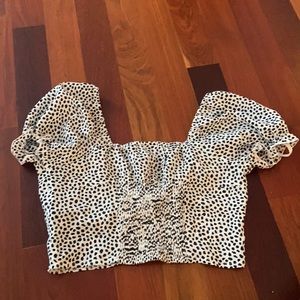 Black and white patterned button up crop top puff sleeve cinched