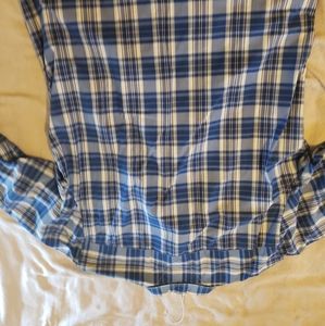 Blue and white patterned button up. Good for the office, restaurants, bars, etc.