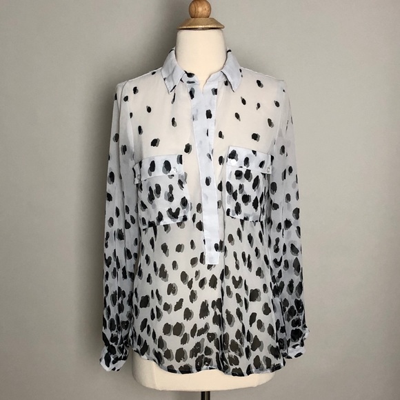 Slightly sheer, black and white button up blouse.