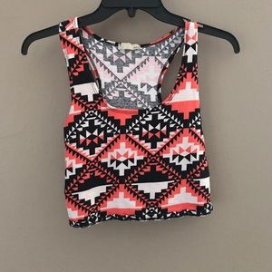 Orange black and white patterned crop top. When I bought it, it said small but this one is more loose than the others I bought from the store. So it could fit a bigger size.