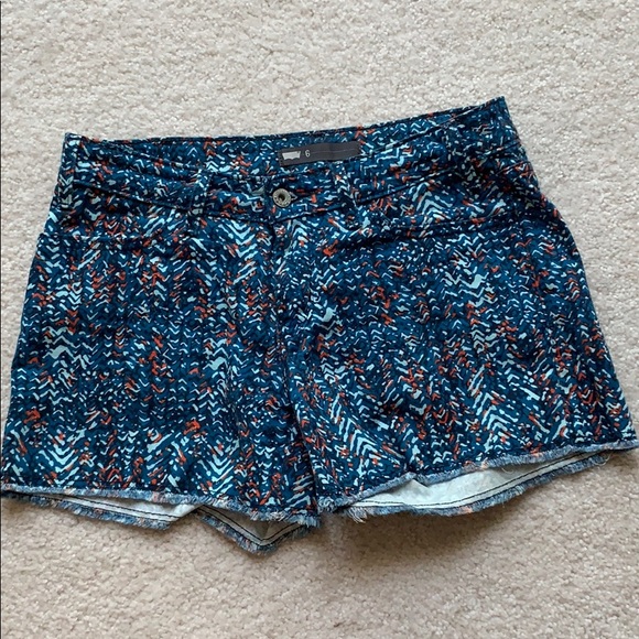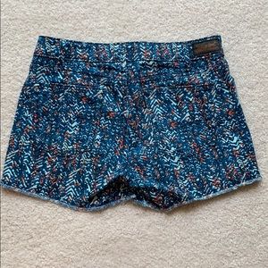 Levi's patterned denim shorts size 6. 3 in inseam and approximately 31 in waist. Pattern is primarily turquoise followed by light blue and coral. Like new!