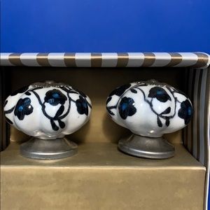 White drawer pulls pattered w black and blue flowers and silver accents. In original box but no price tag. Never used.