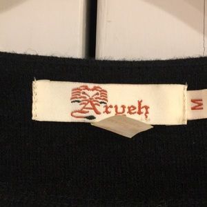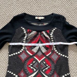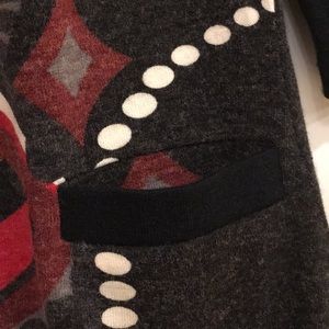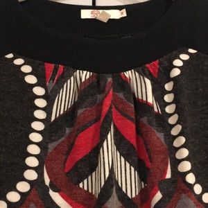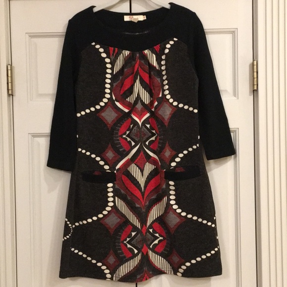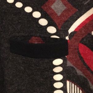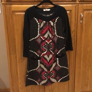 Black dress with fun red, white, and gray pattern on front and back. Two front pockets. Like new.