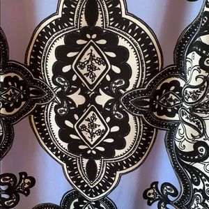 Black, cream and periwinkle make for a pretty combination! Cap sleeve. Pattern down center is slimming. Wear alone or pair with leggings and jean jacket into the fall!