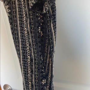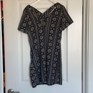 Blue, Dark blue, and white dress with criss cross detailing on back and a side zipper to put on/ take off.
