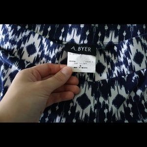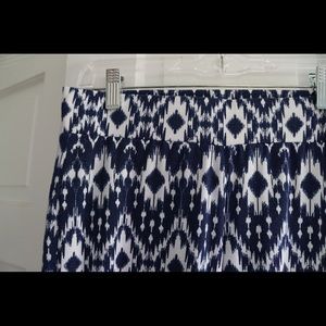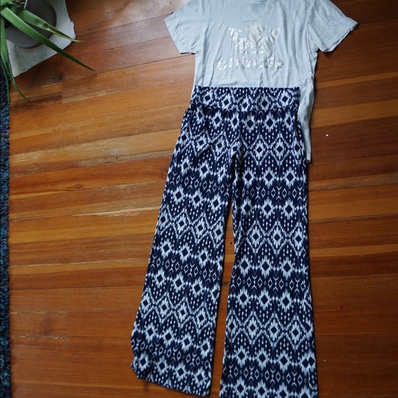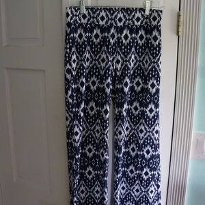Navy and white patterned, bell bottoms, elastic waist band, stretchy, slightly larger than size, gently worn, shirt is also available for sale.