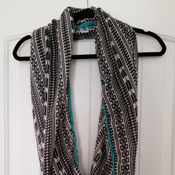 Brand new, never worn, Lightweight infinity scarf, black and white patterned with a turquoise trim.