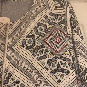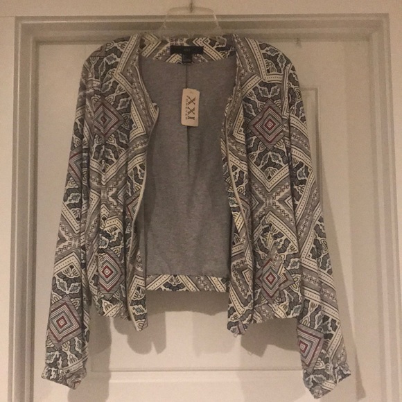 Lightweight jacket with intricate pattern and tinges of pink, blue, and green