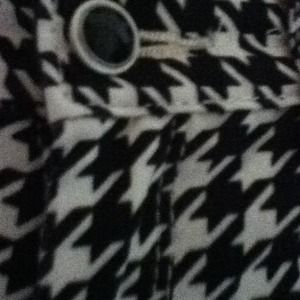 Black and white houndstooth skinny jeans, Black button with gold lining, above ankles.