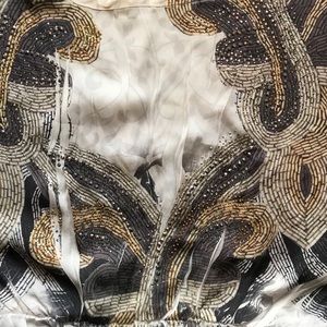 This dress is slightly off white/slightly see through with gold and black designs. The pattern is similar to a paisley print, with elaborate textures. The material is light weight and loose fitting with an elastic band to accentuate your waist!
